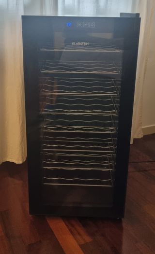 Cantinetta termoelettrica Klarstein Frigorifero, Frigo, 36 Bottiglie, 118 L, 8 Ripiani Rimovibili, Acciaio Inox, LED, Temperatura di Raffreddamento Regolabile, Porta in Vetro, Silenzioso, Nero Frigorifero, 36 Bottiglie, 118 L, 8 Ripiani Rimovibili, Acciaio Inox, LED, Temperatura di Raffreddamento Regolabile, Porta in Vetro, Silenzioso, Nero opaco, libera installazione, Compatto con congelatore interno, illuminazione interna, 101 x 46 x 51 ( H x L x P)Vivo Vino, ideale per conservare al meglio le tue bottiglie di vino. - Design elegante e moderno. - Ampio spazio interno con ripiani cromati.