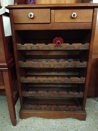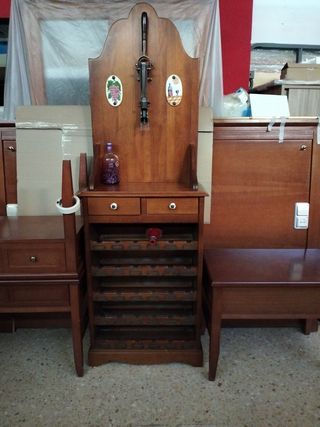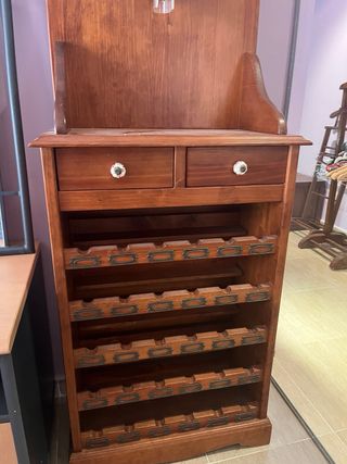 Mobili unici in stile rustico, perfetti per riporre bottiglie di vino con apribottiglie integrato. È un mobile molto particolare e molto ben tenuto. - Struttura principale in legno. - Dettagli e supporti in metallo.