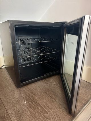 Mini cantinetta con capacità per 12 bottiglie. Design moderno e compatto. Porta in vetro. Ripiani interni.
