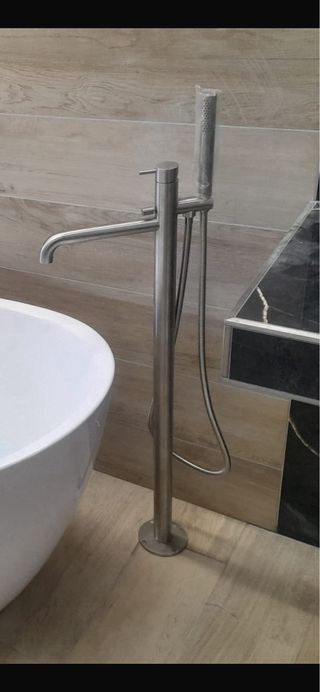 Elegante fontana a piantana per vasca da bagno, dal design moderno e funzionale. - Finitura in acciaio spazzolato. - Doccetta estraibile inclusa. - Installazione a pavimento.