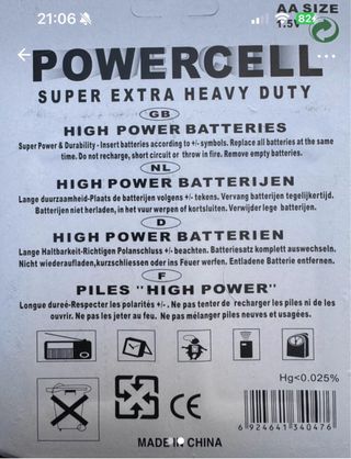 Confezione da 16 pile AA Powercell Super Extra Heavy Duty. - Tipo: AA (UM-3) - Marca: Powercell - Serie: Super Extra Heavy Duty - Quantità: 16 pezzi - Voltaggio: 1.5V