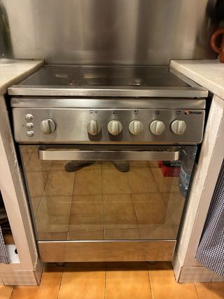 Cocina de gas con cuatro quemadores y horno. - Encimera de acero inoxidable. - Mandos frontales. - Puerta de horno con cristal. - el horno también funciona con gas, y funciona o bien por arriba o por abajo, pero no los dos a las vez.
