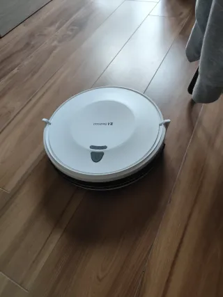 Robot aspirapolvere di colore bianco, ideale per la pulizia della casa. - Design rotondo e compatto. - Pulsante di accensione/spegnimento visibile.