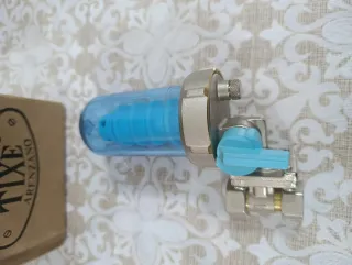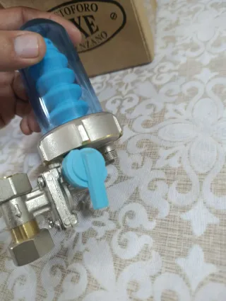 Valvola con un filtro interno di colore blu. Il corpo della valvola è in metallo con dettagli in ottone e una leva di comando azzurra. - Filtro interno a soffietto di colore blu. - Corpo valvola in metallo. - Leva di comando azzurra.