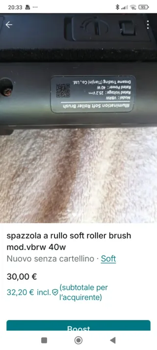 Spazzola a rullo soft roller brush, modello VBRW. - Potenza: 40 W - Voltaggio: 25.2 V - Marca: Dreame Trading (Tianjin) Co., Ltd.