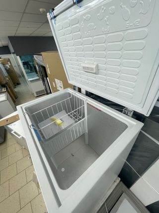 Congelatore a pozzetto bianco. Ha un cestino interno per organizzare il cibo. - Cestino in metallo. - Interni spaziosi.
