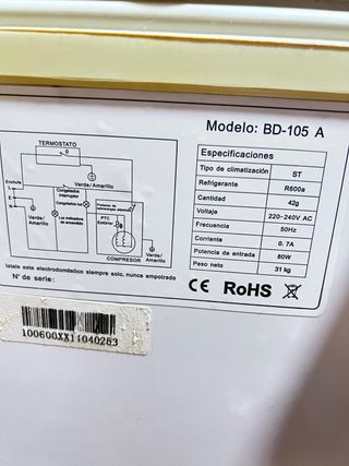 Funziona perfettamente. Congelatore orizzontale a pozzetto con una capacità di 105 litri. Modello BD-105 A. - Tipo di climatizzazione: ST. - Refrigerante: R600a. - Quantità di refrigerante: 42g. - Voltaggio: 220-240V AC. - Frequenza: 50Hz. - Corrente: 0.7A. - Potenza in ingresso: 80W. - Peso netto: 31 kg.