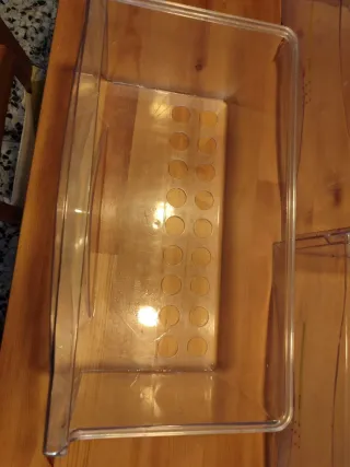 Cassetto del congelatore della marca Amica. Pezzo di ricambio o per sostituzione. Materiale: plastica trasparente. Misure nelle foto. Piccolo difetto sul lato destro, visibile nelle immagini. Dimensioni: 19 cm altezza x 42 cm larghezza x 35 cm profondità.