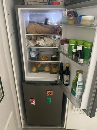 Frigorifero/congelatore compatto, ideale per spazi ridotti o come unità aggiuntiva. Piccoli segni d'uso. - Design verticale. - Colore bianco. - In perfetto funzionamento. **POSSIAMO PORTARTELA, MA IL TRASPORTO È A PARTE**