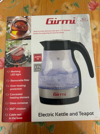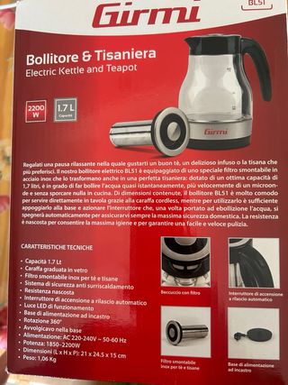 Bollitore elettrico Girmi in vetro con capacità di 1.7 litri. - Potenza 2200W - Luce LED - Filtro removibile - Protezione surriscaldamento - Elemento riscaldante nascosto - Base con rotazione 360° e avvolgicavo