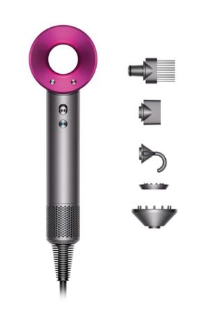 Asciugacapelli Dyson Supersonic in colore viola. Progettato per un'asciugatura rapida senza calore estremo. - Aiuta a proteggere la lucentezza naturale dei capelli. - Per uno styling liscio e controllato. - Include cinque accessori per lo styling.
