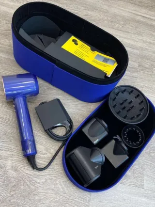 Asciugacapelli Dyson Supersonic in una splendida combinazione di colori blu e rosa, completo di custodia. - Custodia per il trasporto e la conservazione. - Accessori inclusi per diverse acconciature.