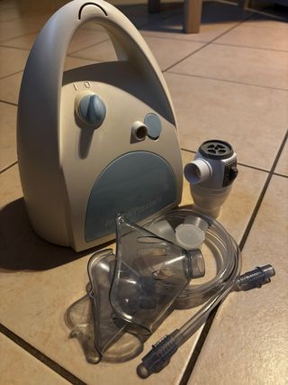 Apparecchio per aerosol marca Fluire Spiro, di colore blu. - Completo di maschera e tubicino. - Design compatto.