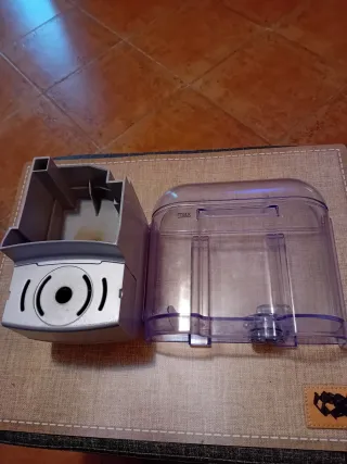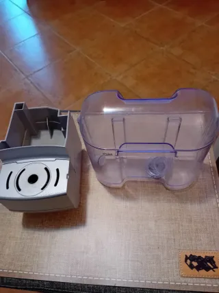 Componenti di ricambio per macchina da caffè. - Serbatoio trasparente con indicatore di livello massimo. - Base in plastica grigia con dettagli neri.