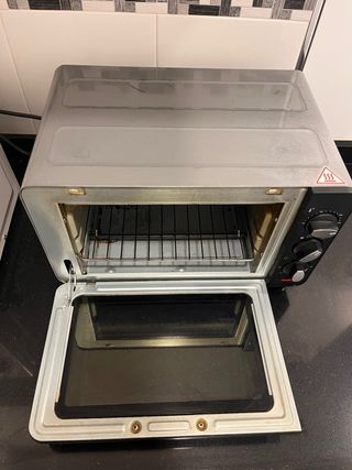 Forno elettrico compatto e versatile, ideale per cucine piccole o per il campeggio. Il suo design moderno in colore nero si adatta a qualsiasi spazio. - Porta in vetro. - Vassoio e griglia inclusi. - Controllo di temperatura e tempo.