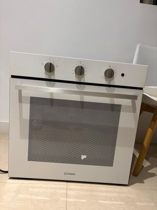 Set di forno e piano cottura in vetroceramica per cucina. - Piano cottura in vetroceramica con superficie nera. - Forno bianco con pannello di controllo. - Comandi rotanti per il forno e il piano cottura. - Marca Indesit.
