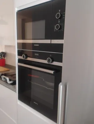 Set di forno e microonde del marchio Siemens. Design moderno in colore nero e acciaio inossidabile. - Forno con porta in vetro. - Microonde con pannello di controllo. - Maniglie metalliche.