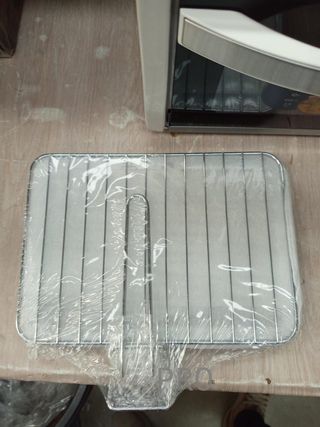 Forno elettrico con finitura argentata e porta in vetro nero. Pannello di controllo con display digitale. Comandi rotanti. Maniglia in metallo. Senza vassoio, solo griglia. Interno pulito.