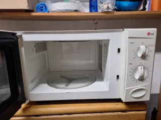 Forno a microonde LG con funzione grill. Funziona correttamente. Marca: LG. Funzione grill. Pannello di controllo con quadranti per potenza e tempo.