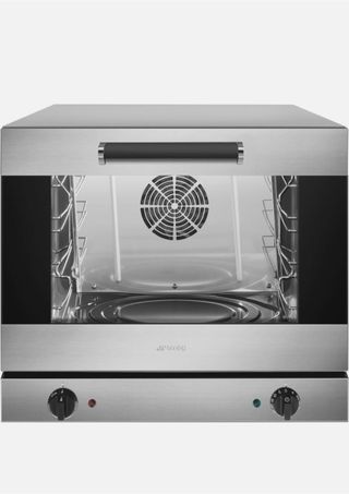Forno di convezione in acciaio inossidabile con porta in vetro. Design moderno e funzionale. Comandi rotanti per il controllo di temperatura e tempo. Vassoi interni a griglia.