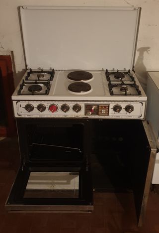 Cucina anni '50/'60 a gas, con forno a gas con timer, due piastre e quattro fornelli, marca Indesit, funzionante, ritiro in loco, no spedizione