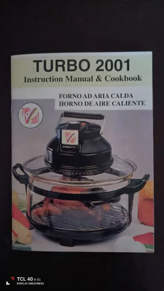 Manuale di istruzioni e ricettario per il forno Turbo 2001. - Copertina con titolo TURBO 2001 Instruction Manual & Cookbook. - Testo aggiuntivo in italiano e spagnolo: FORNO AD ARIA CALDA HORNO DE AIRE CALIENTE. - Logo TURBO 2001 presente sulla copertina e sul forno.