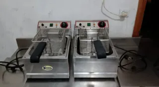 Due friggitrici elettriche in buone condizioni. Ideali per attività di ristorazione. 6Lx6L - Fabbricate in acciaio inossidabile. - Controlli di potenza e temperatura indipendenti. - Valvole di scarico. - Facili da pulire.