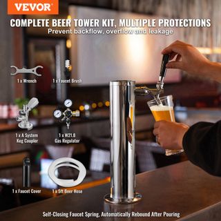 Colonna per birra a doppio rubinetto: realizzata in acciaio inossidabile 304 di prima qualità, la colonna per birra a doppio rubinetto VEVOR offre eccezionale durata e affidabilità, ideale per frigoriferi commerciali e domestici. Regolatore a doppio indicatore: il nostro regolatore W21.8 aggiornato è dotato di doppio indicatore per una migliore funzionalità. Il manometro superiore indica la pressione in uscita, mentre il manometro laterale visualizza comodamente il volume rimanente del serbatoio. Regola e stabilizza facilmente la pressione con la rotazione della manopola di regolazione. Accoppiatore per fusti Sistema A: l'accoppiato