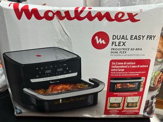 Friggitrice ad aria Moulinex Dual Easy Fry Flex. - Design moderno e compatto. - Due zone di cottura indipendenti. - Possibilità di combinare le zone per una cottura extra large. - Finestra per monitorare la cottura. - Capacità 9L. - Potenza 2.5KG. - Adatta per 8+ persone. - Nuova soltato provata - Prezzo amazon 200