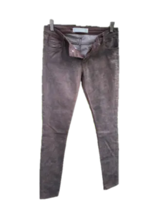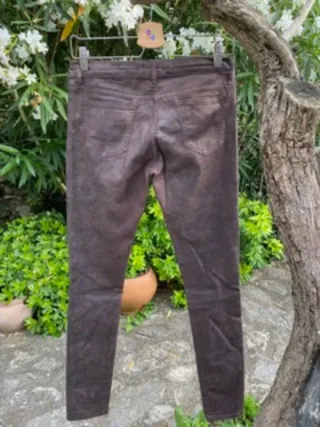 Jeans skinny a vita media con cinque tasche e chiusura con cerniera e bottone. Taglia : W28 (corrisponde alla taglia italiana 42). Materiale : 60% cotone, 29 % poliestere, 4% lycra. Trattamento : lavaggio in lavatrice a 40°. Questo jeans è in cotone elasticizzato di colore marrone con effetto leggermente laminato. La marca parigina 75 Faubourg ama giocare con le materie per creare dei jeans "seconda pelle" eleganti, comodi e originali.