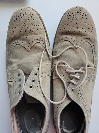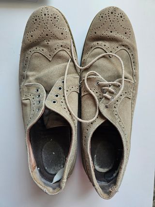 Scarpe da uomo in pelle scamosciata Mocassini Manca un laccetto Tg 45 Made in Italy Colore marrone chiaro / beige Sono state lavate in lavatrice e la pelle si è indurita, devono essere trattate con prodotti appositi o portate da un calzolaio