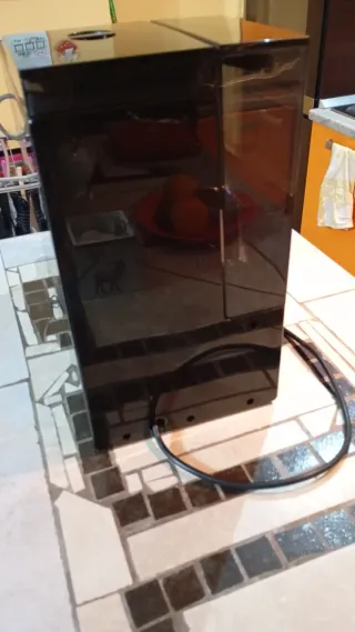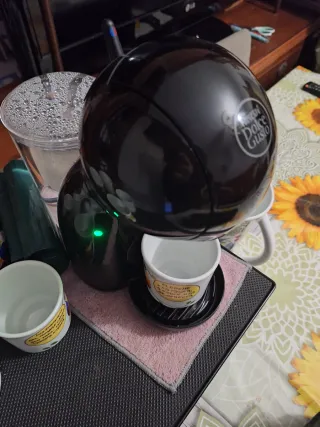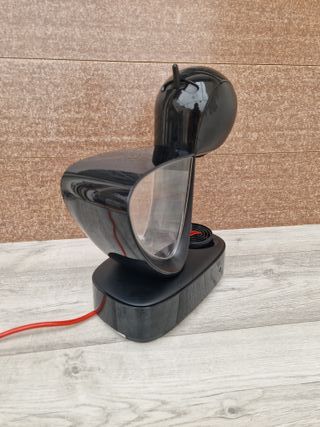 Macchina da caffè Dolce Gusto in colore nero. Design compatto e moderno. Ideale per preparare caffè e altre bevande. Cavo di alimentazione rosso. Praticamente nuova. Se riempita troppo perde un po' d'acqua, credo accada a quasi tutte.