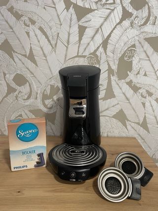 Macchina da caffè Senseo Marcilla in colore nero. Include due filtri per monodose. Design compatto e moderno. Facile da usare e pulire. Include scatola di decalcificazione Senseo Philips.