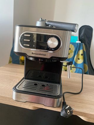 Macchina da caffè automatica Bonsenkitchen in buone condizioni. Design moderno in acciaio inossidabile e nero. Pannello di controllo con pulsanti. Serbatoio dell'acqua estraibile. Vassoio di goccia. Vaporizzatore per latte. Il manico del portafiltro è un po' usurato dall'uso, ma svolge perfettamente la sua funzione.