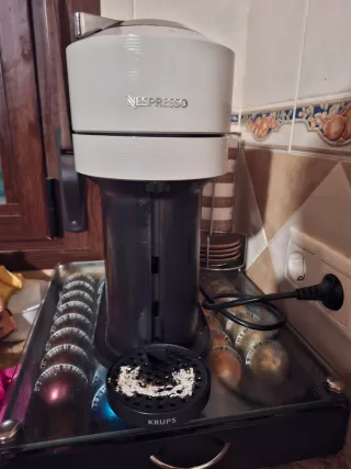Mi sono stati regalati due per Natale... e la scatola si è rotta per la pioggia lasciandola in terrazza, la macchina da caffè è SENZA UTILIZZO. Macchina da caffè Nespresso del marchio Krups. Design moderno e compatto. Colore bianco e nero. Vassoio raccogli gocce. Base antiscivolo.