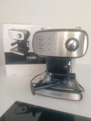 Macchina da caffè espresso della marca KUBO KBECM4842, con un design moderno ed elegante. 15 Bar, 850 W. Finitura in acciaio inossidabile e nero. Pannello di controllo con pulsanti. Serbatoio dell'acqua estraibile.