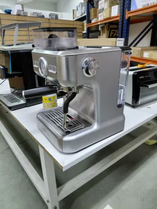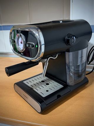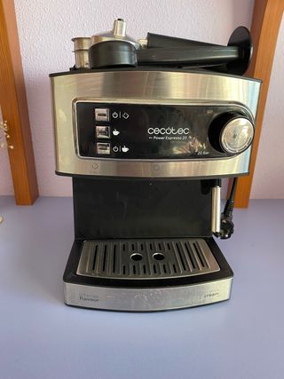 Macchina da caffè Cecotec, modello Power Espresso 20, con finitura in acciaio inossidabile e dettagli in nero. Progettata per preparare caffè rapidamente e facilmente. Pannello di controllo con pulsanti, serbatoio dell'acqua estraibile, vassoio di goccia, accessorio per vaporizzare il latte incluso. Caffè di ottima qualità, usato solo un paio di volte ma mi trasferisco e non ho spazio.
