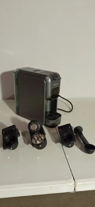 Macchina da caffè Cecotec in grigio, compatibile con tutti i tipi di capsule. Include vari accessori per l'uso.