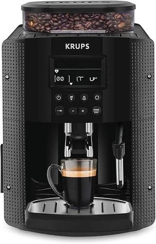 Macchina da caffè del marchio Krups in colore nero. Progettata per preparare il caffè in modo rapido e semplice. Pannello di controllo con quadrante e pulsanti, indicatori luminosi, vaporizzatore, vassoio raccogli gocce.