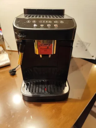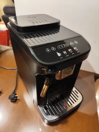 Macchina da caffè superautomatica DeLonghi Magnifica S in colore nero. Permette di preparare caffè con chicchi o macinato. Questa nuova versione ha ancora la pellicola protettiva sullo schermo. Pannello di controllo con quadrante rotante. Vassoio di goccia estraibile. Vaporizzatore per latte.