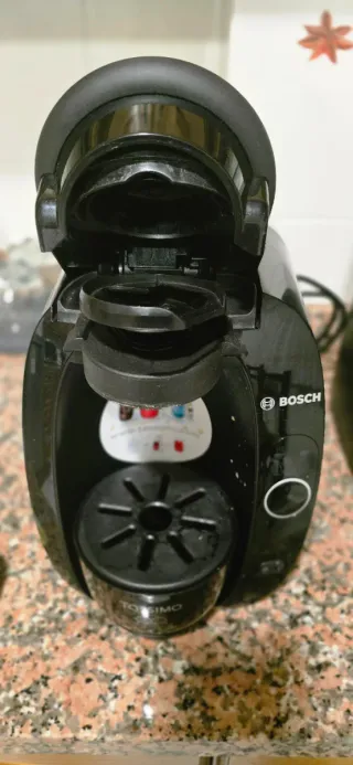 Macchina da caffè Tassimo Bosch in colore nero. Funziona, prepara bene le bevande ma non riscalda. Il pulsante di avvio e arresto non funziona bene. Possibilità di utilizzo per parti poiché il resto è in buone condizioni. - Modello Tassimo. - Marca Bosch. - Colore nero. Spedizione con 2 scatole di capsule.