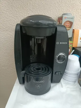 Macchina da caffè a goccia in colore nero e grigio. Include scatola di filtri per caffè. Marca: Tassimo. Capacità: 12 tazze. Indicatore del livello dell'acqua. Filtri taglia 4.
