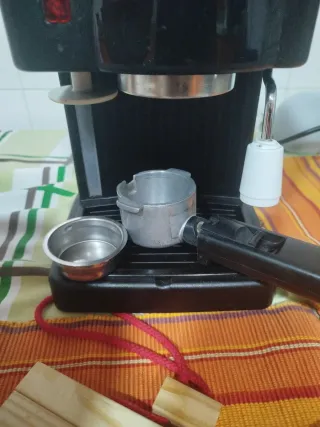 Macchina da caffè De'Longhi Dedica. Gli accessori sono stati sostituiti con altri di migliore qualità: portafiltro Neouza 51mm con cesta non pressurizzata (ugello doppio, tre orecchie), livellatore di caffè da 51 mm, distributore a 6 aghi, anello dosatore, pressino per caffè tamper.