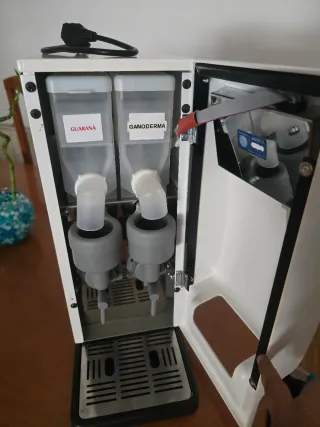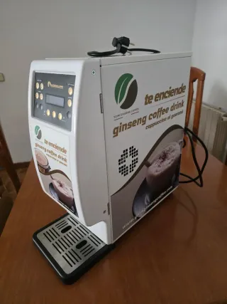 Macchina da caffè per preparare bevande al ginseng. Design bianco con grafiche accattivanti. Include vassoio di raccolta gocce. Display digitale e pulsanti di controllo.