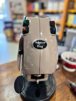 Macchina da caffè Didiesse Frog, un'icona di design per la tua casa o ufficio. La sua forma unica e il colore beige la rendono un oggetto d'arredo. - Design a forma di rana. - Colore beige. - Pulsanti di controllo colorati.