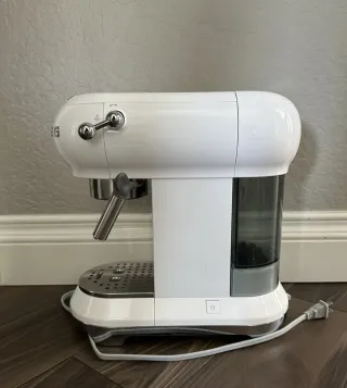 Macchina da caffè espresso Smeg in stile anni '50, colore bianco. Unisce un design iconico a funzionalità. - Design retrò distintivo. - Colore bianco lucido. - Include manuali di garanzia in diverse lingue.