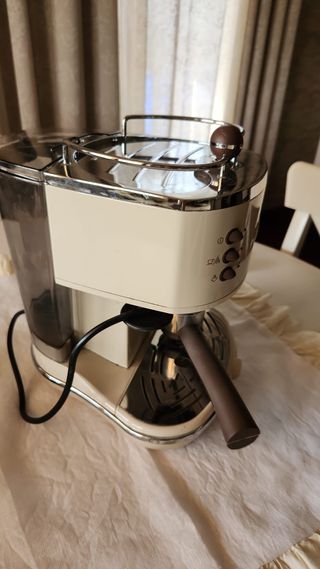 Macchina per caffè espresso DeLonghi dal design retrò e accattivante, in una elegante colorazione beige. - Finiture cromate lucide. - Pannello comandi con pulsanti. - Pompa per caffè espresso.