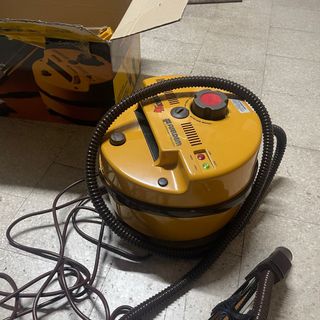 Aspirapolvere a vapore di colore giallo. - Tubo flessibile nero. - Cavo di alimentazione. - Ugello di aspirazione. - Manopola rossa per il serbatoio dell'acqua.