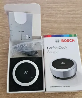 Sensore wireless Bosch/termometro di cottura HEZ39050 Perfect Cook, in nero/argento Prodotto pari al nuovo, mai usato e nella sua confezione originale. Design moderno e compatto. Ideale per un controllo preciso della temperatura. La scatola contiene: 1 Sensore di cottura wireless 1 Batteria 5 Cuscinetti in silicone NB: Solo per piani cottura a induzione compatibili con i sensori Bosch Perfect Cook. #bosch #masterchef #cucina #induzione