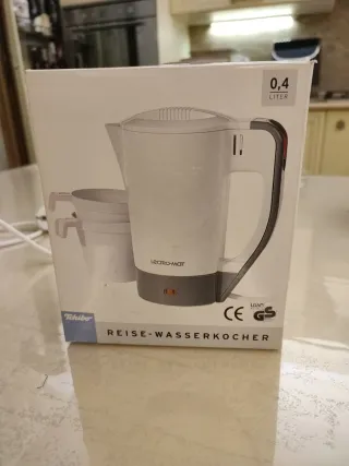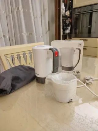 Bollitore elettrico Tchibo, ideale per viaggiare o per piccoli spazi. Capacità 0.4 litri. - Design compatto e portatile. - Colore bianco e grigio. - Include sacca porta-bollitore.